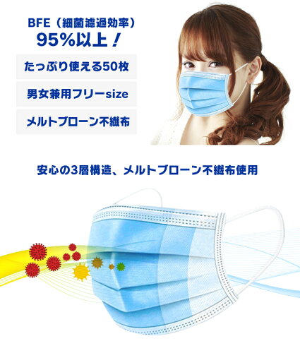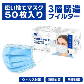 【在庫あり】使い捨て マスク 50枚セット三層構造 箱入り 日常用 飛沫防止 BFE95%以上 レギュラーサイズ メンズ レディース 男女兼用 掃除 通勤 通学 花粉 対策【フリーサイズ ライトブルー】